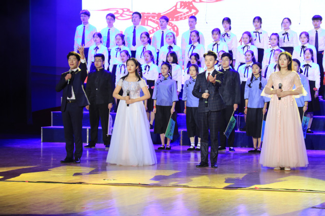 姚书记沉稳浑厚的声音将观众与评委送回八十三年的那个阴冷的冬天。四位领诵同学站在舞台最前方,他们身着优雅的礼服,声情并茂地吟诵着;舞台中央,群诵的同学们高举野菊花大声呐喊“呼唤!呼唤!”;舞台左侧,邱天老师和同学为大家带来了生动的小情景剧表演。表演展现出那个战火纷飞的年代里的青年人一腔赤诚的爱国热情,与整体朗诵相得益彰;舞台右侧,身着民国学生装的同学们摇着自制的彩旗,大喊口号,还原了当时青年学生游街反抗的场景。最后,全体同学高举手臂,整齐地撒出攥在手心里的飘扬的红丝带。整个场面热血沸腾,将朗诵演出带入了最高潮。