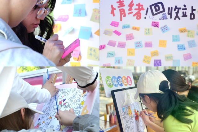 活动现场打造三大主题互动区,形成完整情绪认知闭环。“焦虑解忧站”运用心理学投射原理,引导参与者通过匿名书信漂流将情绪具象为实体盲盒,依托“心灵树洞”实现跨时空朋辈互助;“快乐补给站”创新设置情绪代谢系统,学生将负面情绪书写后折成箭的形状投入回收装置,通过趣味投壶游戏完成“情绪断舍离”,在趣味互动中完成压力释放;人气最高的“情绪调色盘”融合艺术疗愈理念,借助色彩心理学卡牌与流体画创作,帮助学生在色彩碰撞间解码情绪密码。