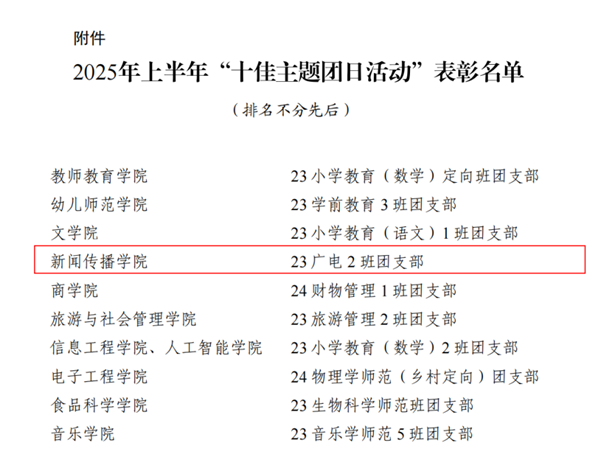 自我校2025年上半年“矢志笃行承使命,青春奋进建新功”十佳团日展评活动启动以来,新闻传播学院团委精心组织、各团支部踊跃参与,经学院初选、校级评审,新闻传播学院2023级广播电视学2班团支部荣获2025上半年“十佳主题团日活动”荣誉称号。