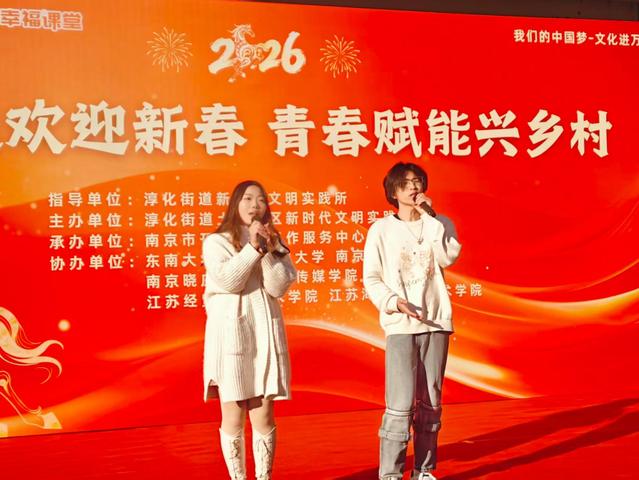 2025年12月26日下午,南京江宁区淳化街道土桥社区桂花园广场热闹非凡,以“社校联欢迎新春・青春赋能兴乡村”为主题的“村晚+游园会”活动圆满举行。南京晓庄学院新闻传播学院作为优秀共建单位受邀参与,不仅带来了精彩的文艺演出,更获颁“优秀共建单位”荣誉称号,彰显了校地协同育人的丰硕成果。