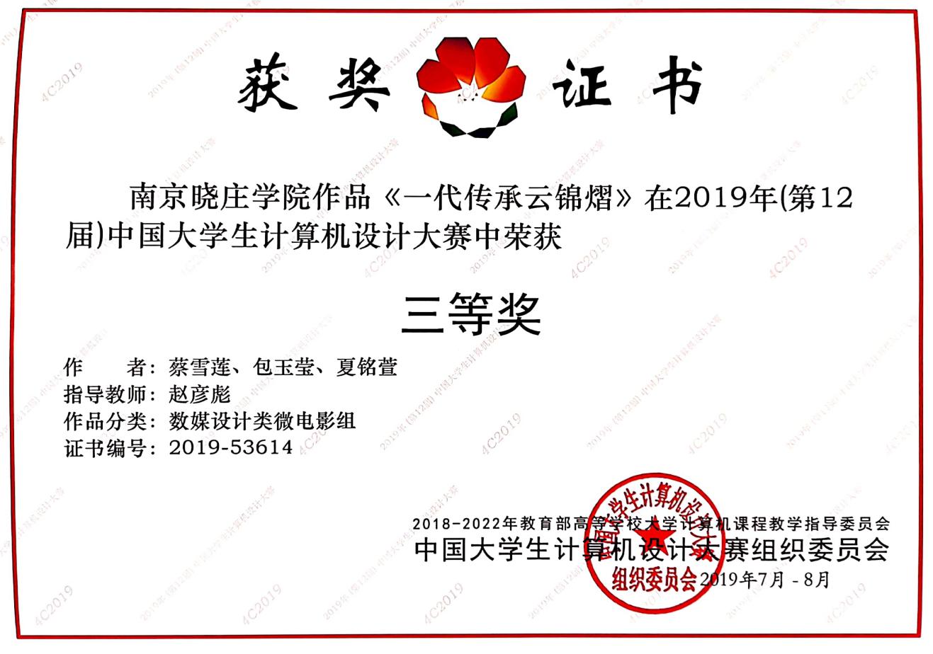 8月23日-27日,第12届中国大学生计算机设计大赛——数媒微电影总决赛在浙江音乐学院举行,新闻传播学院赵彦彪老师指导的两支代表队参加此次总决赛并获一、三等奖共2项,其中纪录片《木画人》(闫睿虎、花徐伟、徐鹏、张凯源、勾戬)获一等奖,纪录片《一代传承云锦熠》(蔡雪莲、包玉莹、夏铭萱)获三等奖。