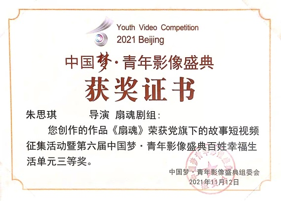 近日,我院学生作品在第六届中国梦·青年影像盛典中获奖。18广编1班姚世龙同学创作的作品《纸间传承》荣获第六届中国梦·青年影像盛典百姓幸福生活单元二等奖;17广转班唐陈、许卉等同学创作的作品《今天也想遇到你》荣获第六届中国梦·青年影像盛典青春梦单元二等奖;18广编1班朱思琪等同学创作完成的《扇魂》荣获第六届中国梦·青年影像盛典百姓幸福生活单元三等奖,以上获奖作品指导教师均为赵彦彪。