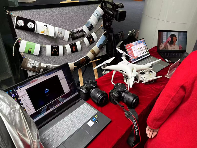 作为开幕式的系列活动之一,在图书馆一楼举办的“强国有我,创意无限”大学生创新实践成果展是展现我校学子创新成绩的重要舞台。我院积极组织学生参与,并通过专业教师推荐和自主申报,遴选出一批能够展现新传学子科技文化创新成果的优秀展品,它们包括《白日梦想家》《世界上另一个我》等优秀摄影作品和创作短片。此外,无人机、单反、摄像机、三脚架、灯光、反光板等新传学子开展创作的重要器械也一并带至现场,前来参观的师生能够在我院解说员的引导下了解文艺作品创新背后的故事。