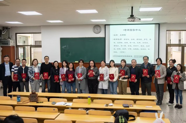 首先,院长罗荣华教授向大家明确了考研指导中心的运作模式。他指出中心负责导师和学生匹配、考研后勤保障、系列讲座安排、复习资料和校友资源推送等工作。考研导师则需在激发学生动力、引导选择考研专业、制定计划、指导复习和面试调剂等方面提供全过程、全方位的指导。通过罗院长的介绍,指导老师们明确了各自的职责和指导方向。随后,学院党总支书记陈长伟与罗荣华院长一同为18名考研导师颁发了聘书,激励他们在新的角色上做出成绩。