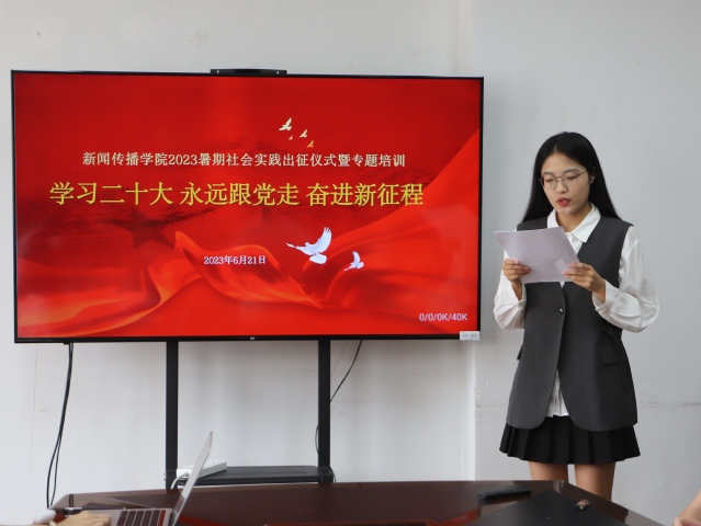 为深入学习贯彻党的二十大精神,引领广大青年脚踏实地、志存高远,在社会课堂中“受教育、长才干、做贡献”,6月21日,我院于莫愁校区2319会议室举办2023年暑期社会实践出征仪式暨“社会实践实施与执行”专题培训。新闻传播学院党总支书记陈长伟、学工办辅导员周琰、徐宇瞳老师、暑期社会实践团队指导教师代表、学生代表以及各班团支书出席本次活动。活动由朱楠同学主持。