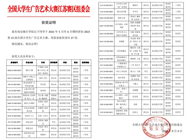 新传院自2019年开始连续组织学生参赛,今年共计获评33个奖项国赛阶段共获6个奖项,其中康玥、方萍同学的《HBNca之文物修复》和贾卓睿同学的《看见的彩铃 让等待更有趣》获评国家三等奖,另有4组作品获评国家优秀奖。在国赛之前的江苏省赛阶段,新传院也一举收获27奖项(包含等奖4项,三等奖9项,优秀奖14项)