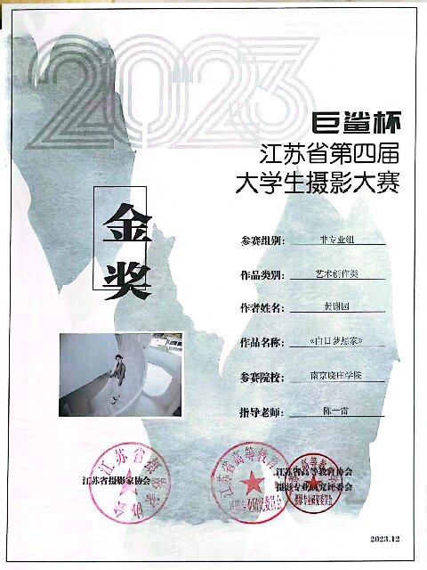 第四届江苏省大学生摄影大赛是贯彻落实党的二十大精神,组织、引导青年人参与社会实践,听党话、跟党走的重要举措,是以“光影相约•时代印记”为主题的摄影大赛。号召当代大学生参与到传播、展示我国社会经济、文化及发展成果的实践中去。黄谢园同学的《白日梦想家》摄影专题,以唯美的构图、独特的造型表现了当代青年人大胆梦想,勇于开拓的精神。《明与暗》《拓出一片黄金地》等作品,均体现了创作者的巧思与创意。